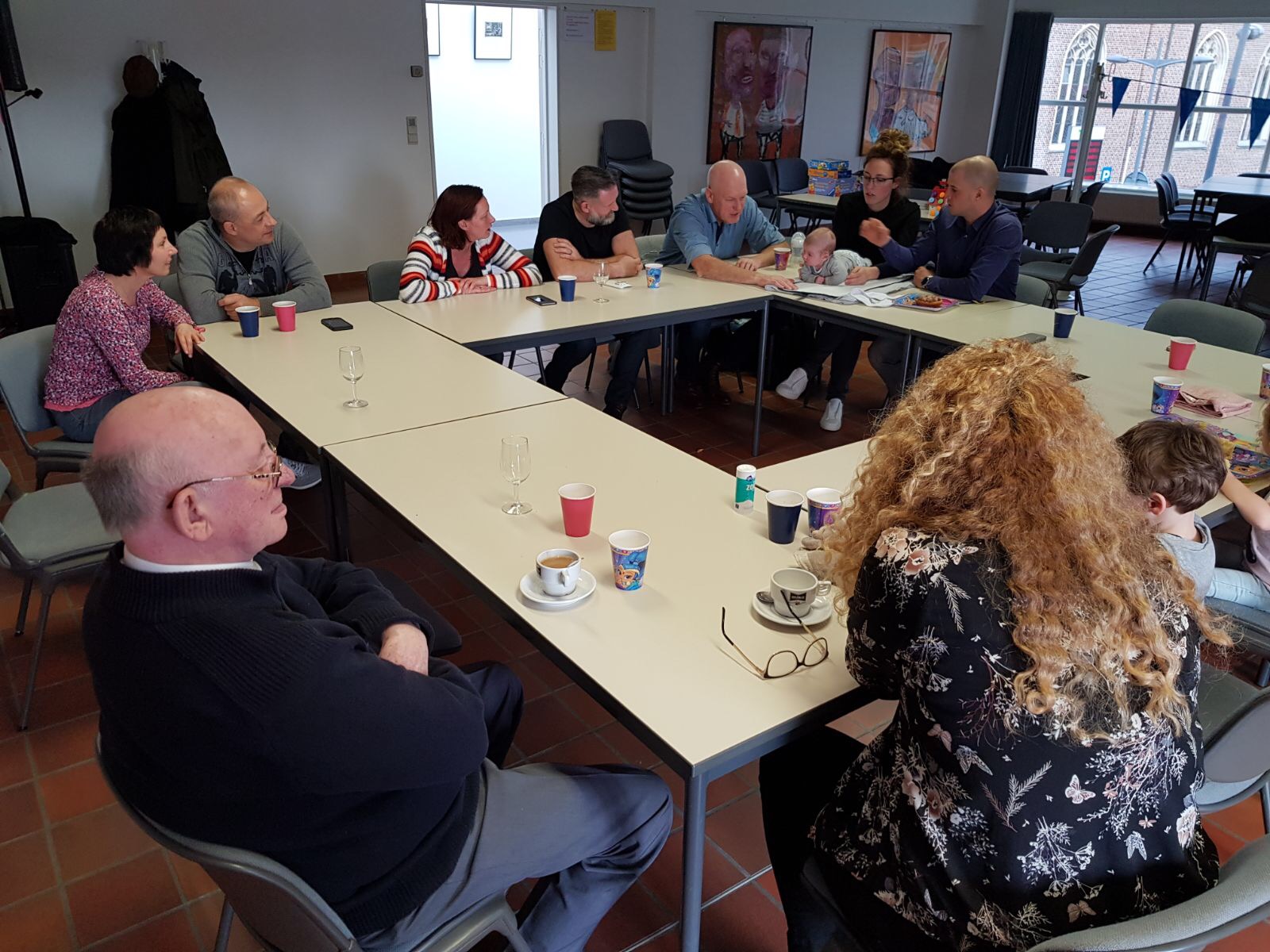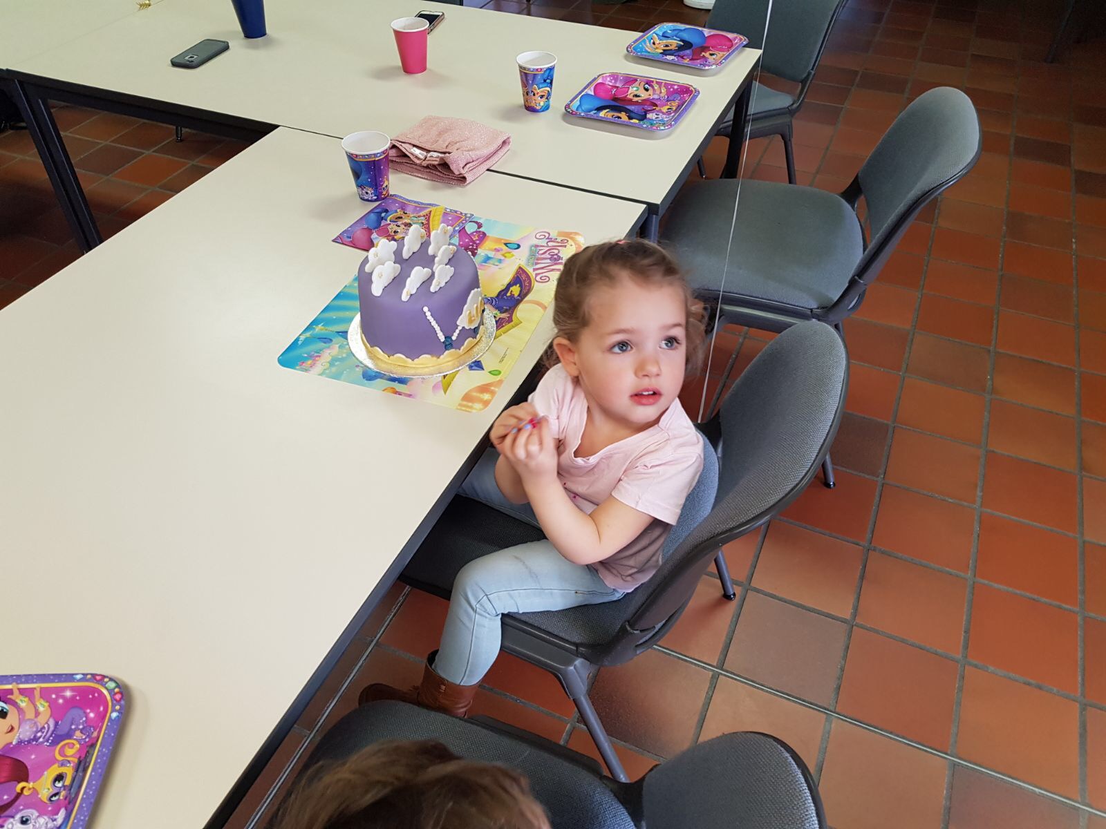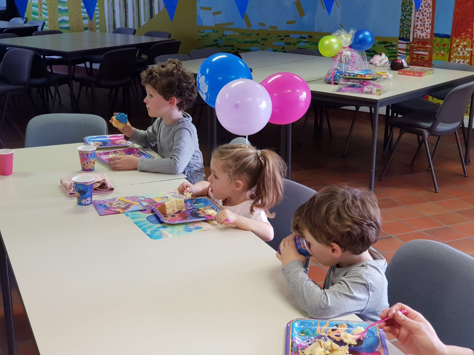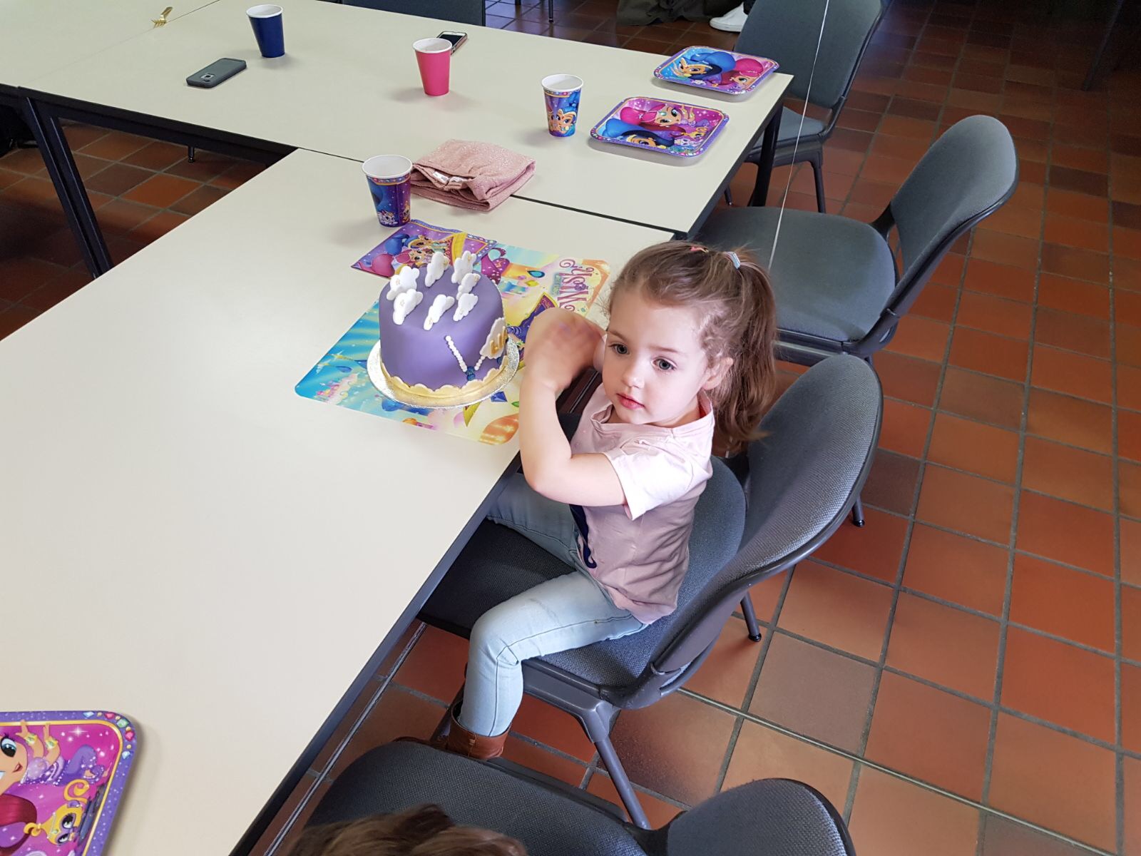 De feestzaal was ook mooi versierd met roze en blauwe vlaggetjes, ballonnen en een grote 3. Een shimmer & shine taart in het paars stond klaar met een hele hoop cupcakes.